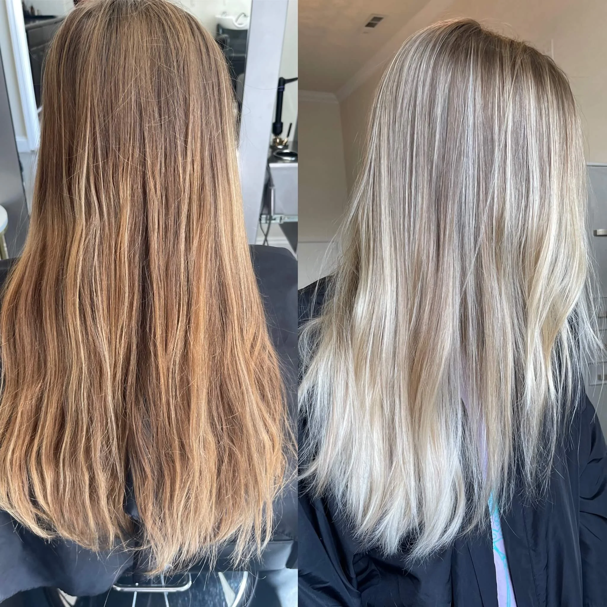 Before traditonal streaky highlight - After “expensive brunette” trend Blended brunette balayage. Super low maintenance